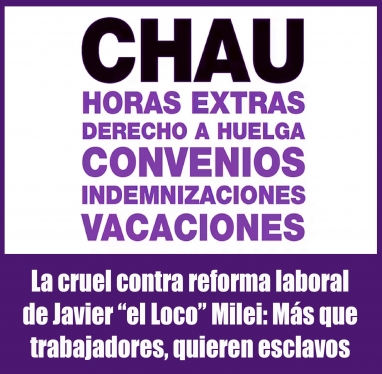 El gobierno anarco capitalista de Javier "el Loco" Milei mandó al Senado un proyecto de contrarreforma para eliminar derechos laborales, sindicales y de huelga que atrasa un siglo. Contra la Constitución desconoce hasta la jornada de 8 horas y el derecho a huelga. Redactado por los abogados de las grandes empresas, de Paolo Rocca, Galperin y Eurnekian, en cada rubro empeora la posición de los trabajadores. Perjudica también a monotributistas e informales y se propone financiar los despidos con la plata de los jubilados.