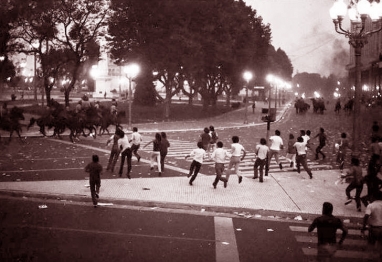 Buenos Aires, 16 de diciembre de 1982, Dalmiro Flores fue asesinado por la Policía Federal en el transcurso de la marcha organizada por la Multipartidaria que se realizo posteriormente a la derrota de la guerra en las Islas Malvinas a mano de los ingleses. Se exige el fin de la dictadura militar y el retorno a la democracia.