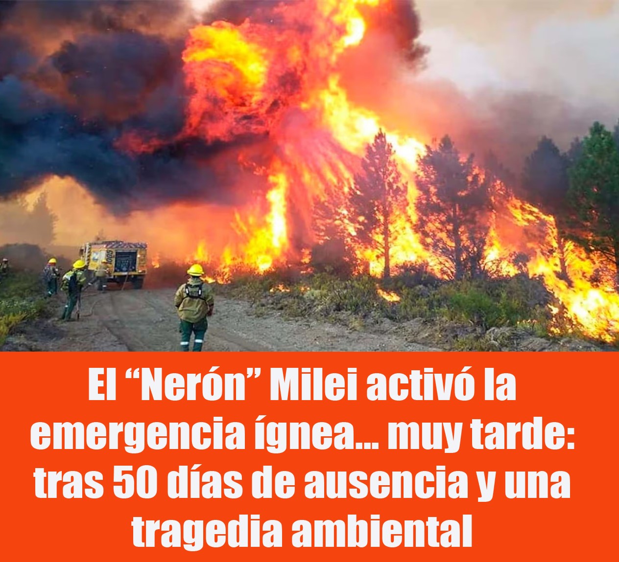 Se ve que Javier "Nerón" Milei suelta la mosca solamente a las piñas: fondos tardíos para el sur que ya se chamuscó como chorizo en la parrilla. Con incendios forestales activos en distintas zonas de la Patagonia y tras reiterados reclamos de gobernadores y dirigentes opositores, el irresponsable Milei, que al igual que el emperador Nerón se dedicó a cantar mientras se incendiaba su país, finalmente destrabó fondos para el sistema de Bomberos Voluntarios y confirmó que declarará la Emergencia Ígnea mediante un DNU. 50 días y 230 mil hectáreas quemadas después.
